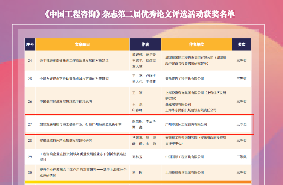 廣州國際咨詢公司榮獲《中國工程咨詢》雜志第二屆優秀論文獎